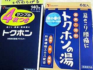 左は、ご存知、痛みのある部分に貼ってみたりして痛みを和らげる鎮痛消炎用のトクホン。