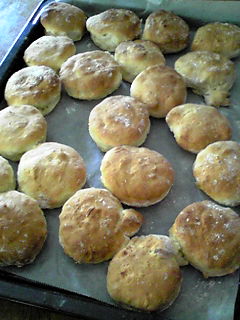 材料は、小麦粉・ベーキングパウダー・生クリーム・牛乳・卵・塩・砂糖。