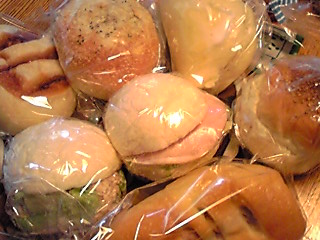 中左より、ツナサンド、ハム卵サンド、白玉あんぱん