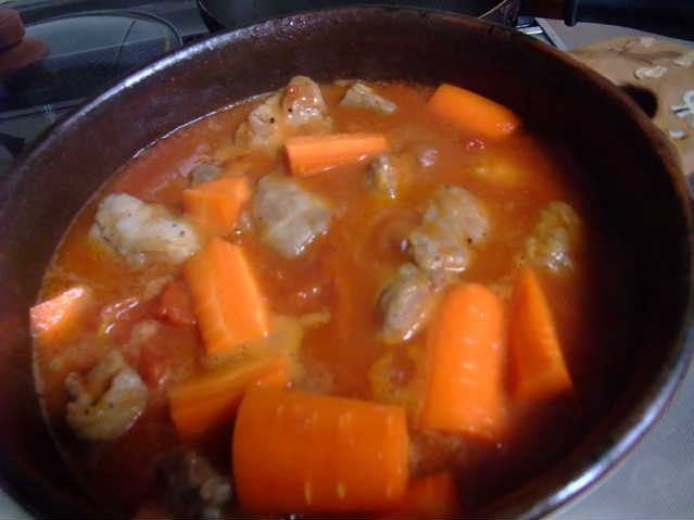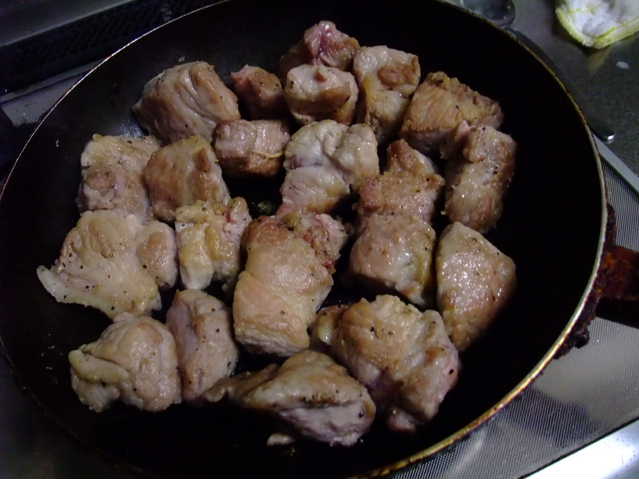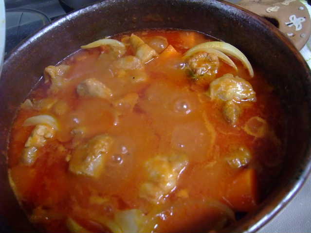 偶然にも我が家は豚肉では無く鶏肉でトマト缶で煮込んだ物を頂きました。