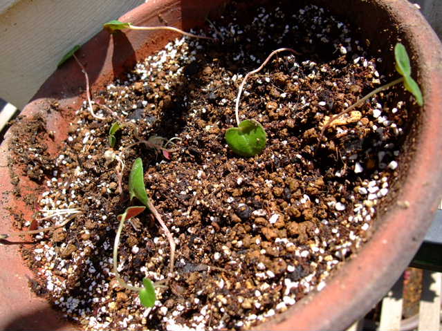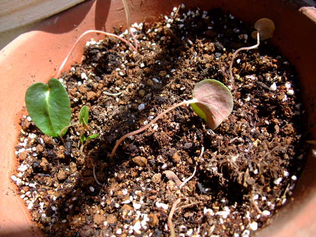 こぼれ種から発芽したシクラメンを鉢に植えつけ。