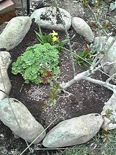 丸い石が余っていたので、ボニカ82’の株のまわりに縁取り。