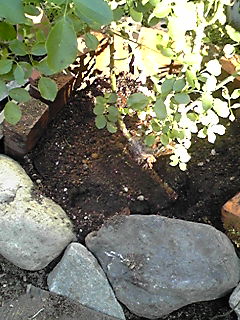 薔薇、地植えのミミエデンが元気がないので、鉢にあげるか考えながらスコップを入れてみる。