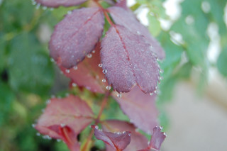 今朝は、薔薇の葉に水滴がついておりました。