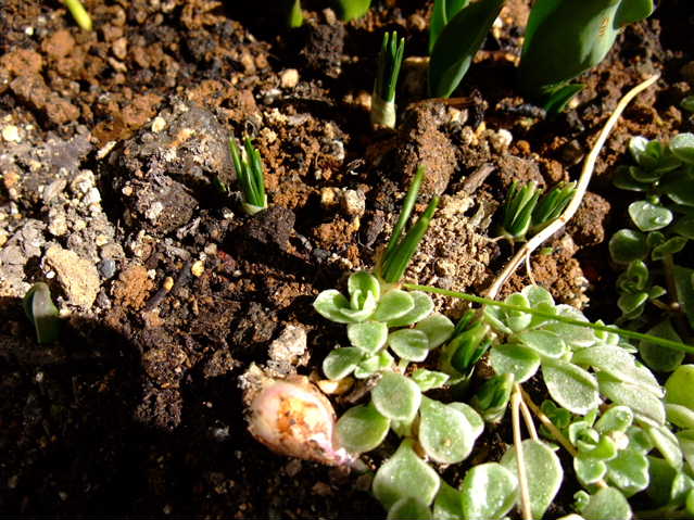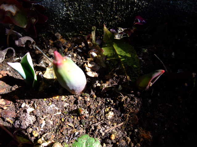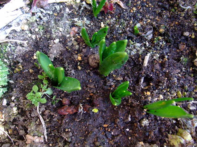 で、雪解けが始まると芽のほうもニョキニョキ地表近くまで出てきて、