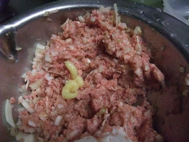 ささみの缶詰を入れて、調味料を入れて練ります。
