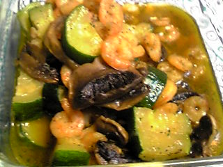 エビとズッキーニを加えて、「アヒージョの素」で煮込みました。