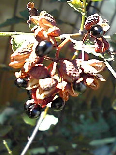 堅い殻がパカッと割れて黒いタネが顔をのぞかせている。