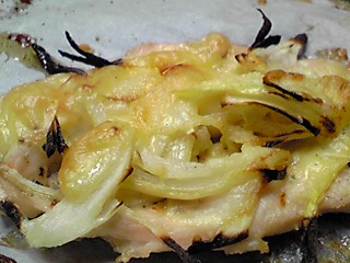 とろけるチーズを載せて、ごま油を軽く回しかけてオーブンで焼く。