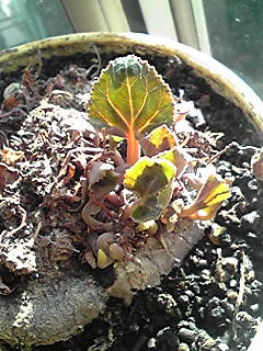 ところが、水やりを続けていましたら球根の一部から葉っぱが出てきましたよ。