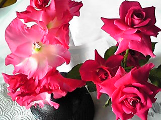 彩音という名前のグラジオラスとブライダルレディというバラのピンク加減が