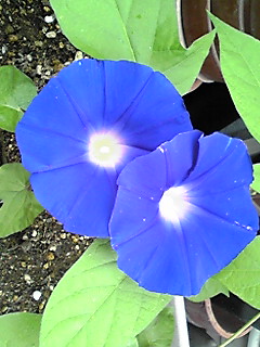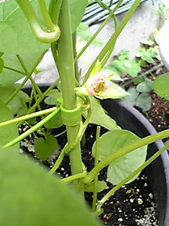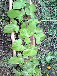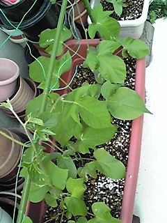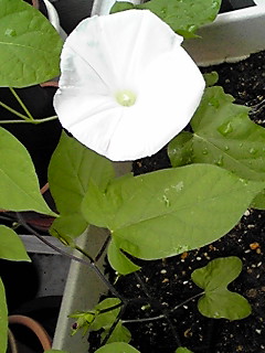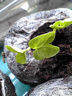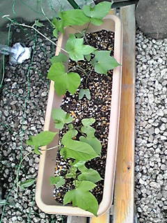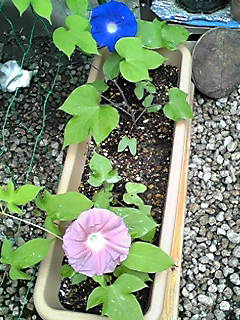 初め小さかった双葉も大きくなって、両脇の朝顔の双葉と同じくらいになってきました。