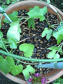 赤ちゃん朝顔、蔓伸びませんかぁ。