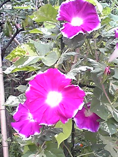 紫の覆輪と青の条絞りそして紅覆輪は、昨年の大輪朝顔ミックスの種と思われます。