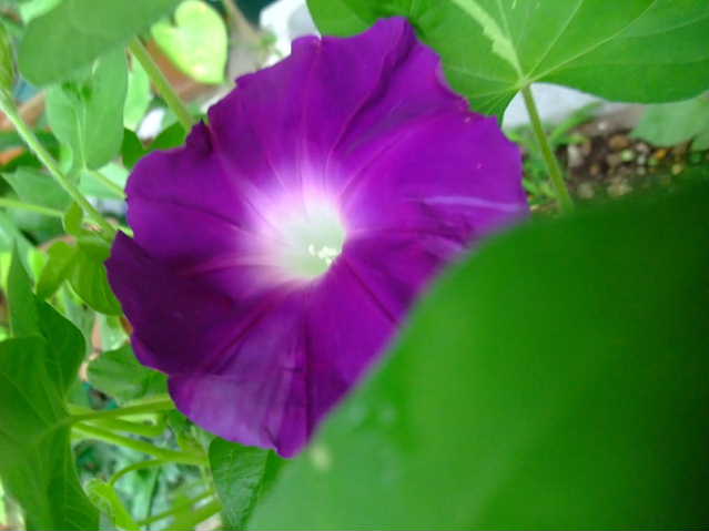 丸葉に濃紫の一重の朝顔。