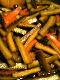 >キンピラゴボウ、スーパーの惣菜でも丸太を四等分にしたような