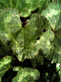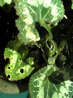 シクラメンの葉裏に小さな青虫がいまして食べられていました。