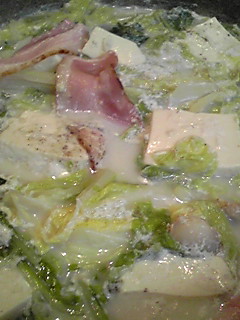 白菜・ホタテ・ベーコン・豆腐に牛乳と白だしを使ってクリーム煮。