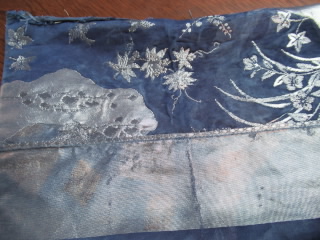 古い帯をほどいて藍染めをした布をもらった。