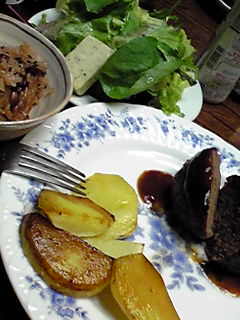 付け合せは、ベイクドポテト、生野菜のサラダたっぷりにちょこんと載っている四角のモノは、