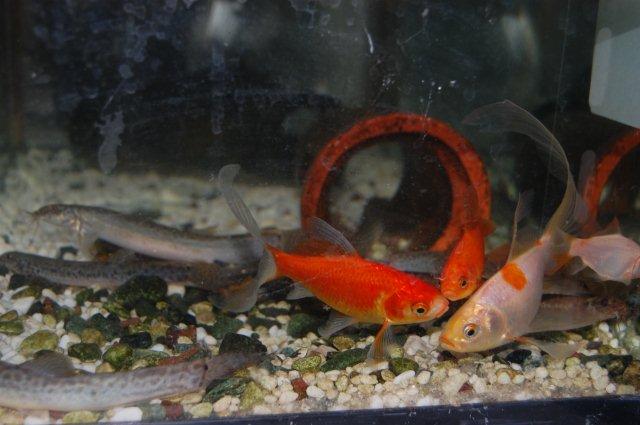 別の水槽にいた、子供の金魚のうち体が大きめの2匹を一緒に入れてみました。