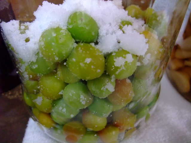 焼酎と塩でまぶして瓶に詰めていく。