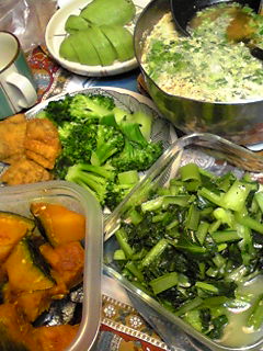 野菜ジュースで我慢。夕飯は、青物をそろえました。