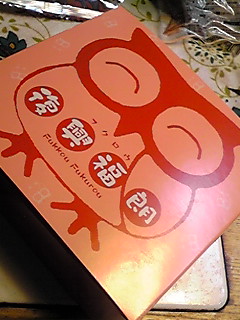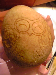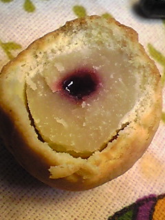 フクロウの絵。中は白餡で真ん中はラズベリーペースト。