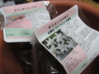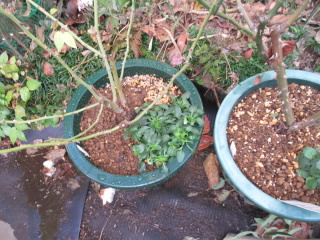 ヘレボ、薔薇、百合の鉢にはビオラかパンジーを1株植えつけ。