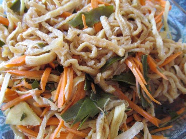 切り干し大根に、昆布、生姜、人参を加えてハリハリ漬けを