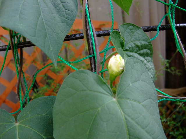 シュートが高く伸びたので、ユー字型の支柱をひっかけてまげて置きました。