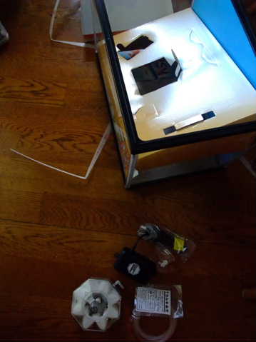 小さなガラスの水槽の上にヒーターを載せて、